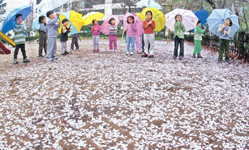“就像是走在雪地裏。”11日,在漢城江南區大峙洞青實公寓兒童樂園,兒童們正在腳踏春雨中飄落的白色櫻花,樂在其中。
