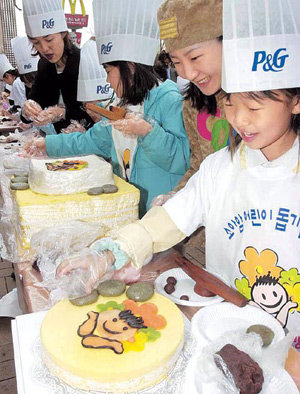 13日,P&G韓國公司在漢城永登浦區文來洞三星之家正門前舉辦了“籌集兒童癌症患者幫助基金,用粘糕製作蛋糕活動”。參加此次活動的兒童們正在用粘糕製作蛋糕。