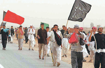 在伊拉克南部城市納西裏耶附近,數十萬聖地巡禮者向依斯蘭什葉派聖地卡爾巴拉行進。
