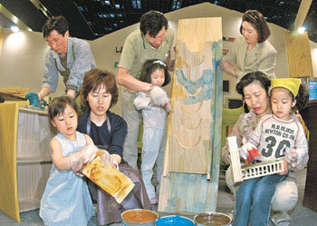 19日,在漢城三成洞COEX大西洋廳舉行的“2003漢城國際家具展覽會”上,主辦方組織了“自己動手做家具”櫃檯,引來市民目光。與父母一起來參觀的孩子們正在往家具上塗顔色。