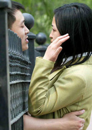 18日,爲防止非典蔓延,下達校園出入禁令的中國瀋陽的一個大學裏,一個男大學生在越過鐵柵欄擁抱自己的女友。