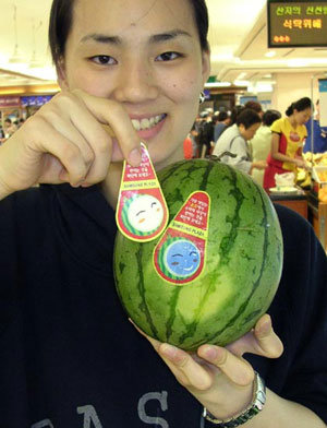20日,前來三星市場盆唐分店的一位顧客正在拿著貼有“溫度計貼紙”的西瓜。在西瓜味道最好時,該溫度計貼紙的顔色會變成藍色。