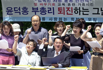 28日,“熱愛學校的家長團體”在漢城鍾路區世宗路世宗文化會館廣場舉行敦促教育副總理尹德弘辭職簽名儀式之前,正在高呼要求尹德弘辭職的口號。
