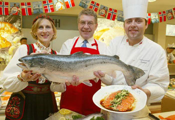 30日,爲宣傳本國水産品而來韓訪問的挪威水産部部長(中)修維茵(音譯)正在漢城小公洞樂天百貨總店食品部親自向顧客介紹挪威産大馬哈魚和大馬哈魚料理。