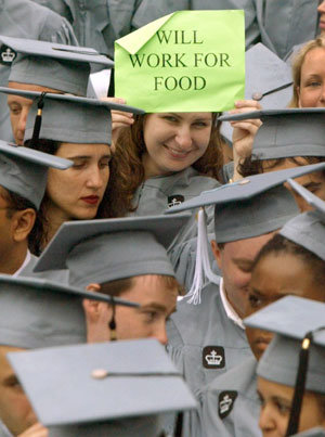 在今年3月份舉行的美國紐約哥倫比亞大學畢業典禮上,經營專業研究生院的一名女學生亮起了寫有“爲了生存,我要工作”的標語。