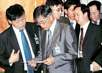 19日上午,總統民政首席秘書(左二)文在寅在首席秘書官及輔佐官會議前,受到記者們有關對北匯款特檢調查期限延長問題的提問。