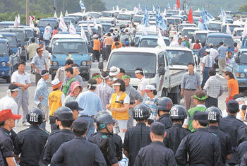 20日,爲了參加反對韓國、智利自由貿易協定集會,而前往漢城的慶北義城郡農民們在中央高速公路義城交叉道正與阻止他們的警方對峙。