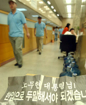 20日,正實施罷工的朝興銀行工會會員們在漢城明洞本店大廳散發了寫有“盧武鉉總統先生!可以出爾反爾嗎?”的傳單。朝興銀行工會表示:“盧總統曾于1月初承諾自救生存,但現在卻推翻了這一承諾。”以此批評了盧武鉉。