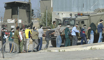 24日,在約旦西岸的南部城市希布倫以色列軍正把一批捆住雙手並蒙上眼睛的巴勒斯坦青少年和男子遣送到附近基地。以色列軍以管制巴勒斯坦過激組織“哈馬斯”爲由,突襲城市逮捕了130多名巴勒斯坦人。