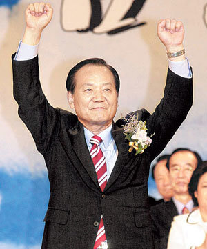 26日,在漢城蠶室室內體育館召開的全黨大會上,當選爲大國家党新代表的崔秉烈候選人正在舉手向黨員致意。