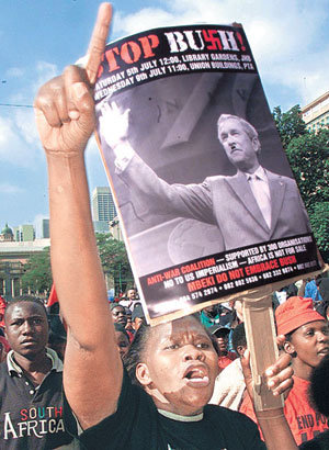 5日,面對美國總統喬治·W·布希的非洲5國巡訪,在南非約翰內斯堡舉行的反美示威中,示威者舉著將布希描繪成希特勒的宣傳畫,正呐喊口號。