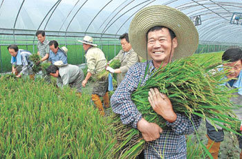 8日,在京畿道利川市戶法面厚安裏的大棚農田內,一位農夫正高興地抱著今年第一次收割的大稻。該農夫於今年1月24日在300多坪農田上扣上了大棚,種植了日留止(音譯)品種大稻。預計收穫量爲350公斤。戶法農協職員們正在幫忙收割。