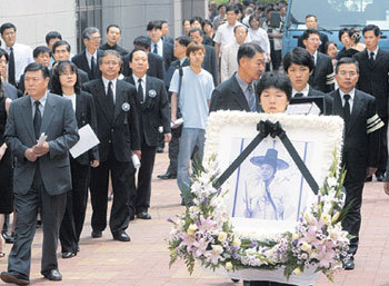 10日上午,在漢城瑞草洞國立國樂院,結束著名演唱家樸東鎮的遺體告別儀式的遺屬和國樂演藝界人士正舉著遺像走向前往墓地的巴士。