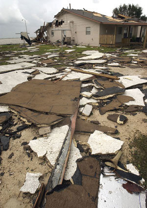 15日,在美國德克薩斯州,因暴風雨和颶風“科洛戴特”被嚴重破壞的波拉稀奧地區到處散落著一所教堂的殘骸。