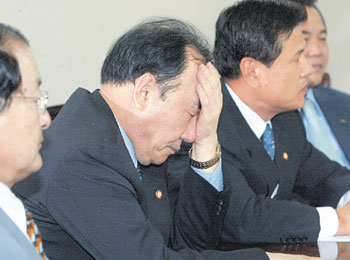 29日,在舉行最後的新黨協調機構會議之前召開的民主黨高層黨務負責人會議上,民主黨事務總長李相洙面帶疲憊的表情閉目苦思。
