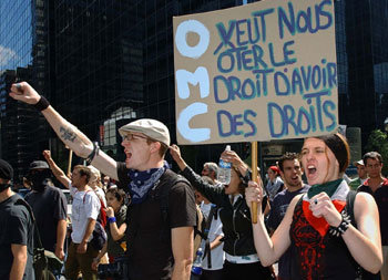 29日,反世界化示威隊員們在召開世界貿易組織(WTO)主要國家非正式內閣會議的加拿大蒙特利爾市內舉著標語牌,高喊著反對世界化的口號,正在遊行。
