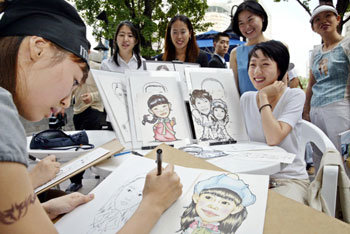 8日,前往漢城一家百貨商店的女顧客正在享受即興漫畫贈品服務。新世紀百貨商店計劃除當天之外,還於9日、15日、16日面向顧客舉行即興漫畫贈品活動。