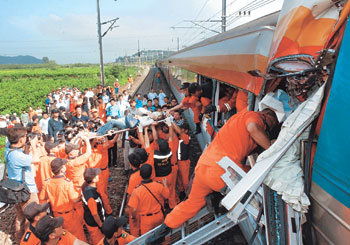 8日上午,在大邱壽城區沙月洞沙月寶城公寓旁的京釜線下行線,“木槿花”列車與停在軌道上的火車相撞,導致90多人傷亡。圖中,119救護隊員正在從列車中搶救傷者。