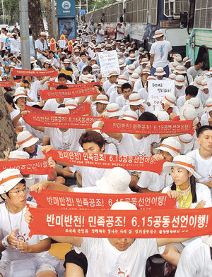 11日,統一聯帶會員和祖國統一泛民族青年學生聯合所屬的學生在漢城龍山美軍第8步兵師基地大門前正在舉行敦促履行《6.15共同宣言》和反美反戰維護和平集會。