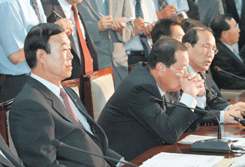 14日,民主黨爲討論黨的前途問題,舉行了黨務會議。在會議上,非主流議員金玉鬥(左)正面容沈重地聽取主張確定全黨大會召開日程的主流議員的發言。