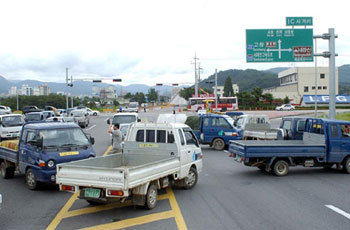 17日,反對建設核電站廢料處理中心(核廢料處理場)的全北撫安郡居民分乘多輛汽車企圖駛入湖南高速公路井邑出口時被警方制止。圖中,示威隊堵住了高速公路。