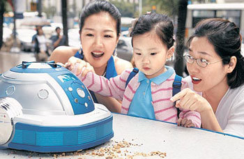 18日,在漢城中區小公洞樂天百貨店特設活動場,一名女孩注視著LG電子的自動吸塵器“ROBOKING”,似乎感到很稀奇。“ROBOKING”通過人工智慧感測器可以自動進行清掃,利用遙控器進行控制。單價爲249萬韓元。