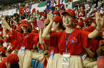 21日,在北韓隊和丹麥隊展開男子排球預賽B組第一場比賽的大邱室內體育館,當302人組成的北韓美女助威團在大邱世界大學生運動會上首次亮相時,“達城之愛組織北方助威團”、“統一市民聯帶阿裏郎助威團”、“大邱銀行北韓助威團”等4000多名觀衆與北韓助威團融合成爲一個整體。