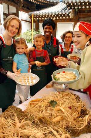 28日,在漢城中區筆洞“韓國之家”由韓國人參公社主辦的“邀請駐韓外國使節家屬人參料理大慶典”上,外國人在參觀人參料理。