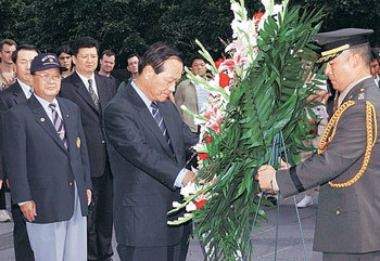 崔代表向坐落在美國的韓國參戰紀念碑獻花