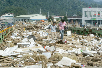 江原道三陟市未老面下巨老裏自去年以來今年第二次遭受了水災。圖中,居民們正在走過去年發生水災以後架起的橋梁,橋上堆積了許多垃圾。每年反復遭受水災的地區並非僅此一處。