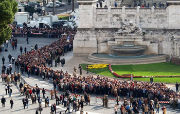 爲悼念在伊拉克犧牲的19名義大利軍警及平民,悼念人群17日聚集到位於羅馬中心地區的VITTORIANO紀念館前。VITTORIANO紀念館裏安放著12日在伊拉克納西裏耶發生的汽車炸彈恐怖襲擊中犧牲的人的屍體。
