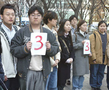 25日,在漢城鍾路區鍾路2街地鐵鍾閣站入口處聚集了抗議承認高考出現多個正確答案的考生和考生家長。他們主張第3個才是正確答案,並舉著寫有“3”字的紙張舉行了示威。
