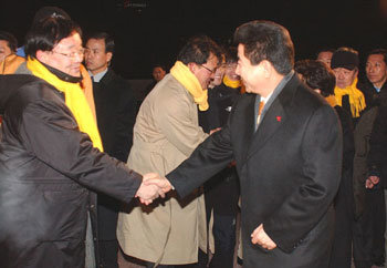 19日,盧武鉉總統(右)參加在漢城汝矣島進行的慶祝總統選舉勝利1周年的“紀念1219”活動時,正在與曾任自己贊助會會長的李基明親切握手。