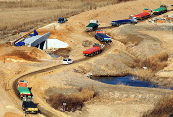 去年12月31日,裝載5萬塊煤炭的卡車正通過江原固城郡統一展望台前面的道路進入北韓。這5萬塊煤炭是韓國的救災團體向北韓支援的。該道路是爲連接在停戰線附近斷開的東海線工程而臨時修建的。