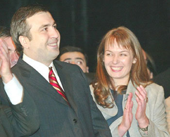去年11月在迫使格魯吉亞前總統謝瓦爾德納澤中途下野的過程中,曾起到主導作用的“天鵝絨行動”的主要人物國民運動党領袖薩卡什維利在4日進行的總統選舉中,實際上已當選爲總統。圖爲他正在接受其夫人的祝賀。