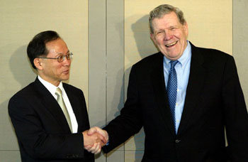 本月舉行北韓核問題第2輪6方會談的可能性越來越大。1日,在漢城朝鮮酒店,正在與外交通商部次官助理李秀赫親切握手的美國國務院負責東亞及太平洋事務的助理國務卿詹姆斯·凱利(右)的表情非常明朗。