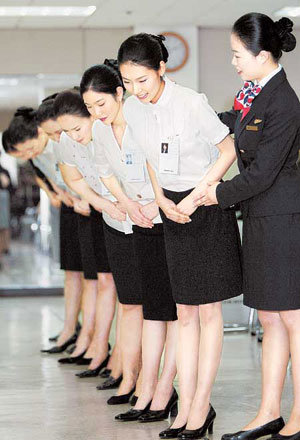 大韓航空公司空姐招聘考試,有9000多人報名參加了空姐選拔,而此次招聘名額爲100人,呈現出有史以來最激烈的競爭。應聘者們爲應對4日在漢城江西區登村洞“大韓航空教育院”舉行的面試,學習禮儀等正在練習作爲“預備空姐”的舉止。