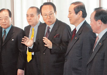12日,國會議長朴寬用(中)在漢城汝矣島的一家餐館內與國會農林海洋水産委員會議員舉行了座談會,請求他們圓滿通過韓智自由貿易協定(FTA)批准動議案。樸寬用還與部分反對FTA的議員進行了激烈的辯論。