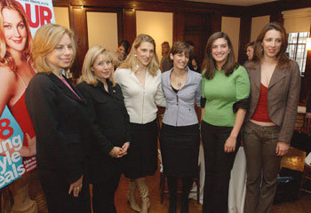 19日,參加在紐約哥倫比亞大學召開的主題爲“女性選民的投票率下降”的討論會的民主黨總統候選人競爭者與副總統切尼的女兒們。左起依次爲參議員約瑟夫·利伯曼的女兒蕾貝卡、副總統切尼的女兒艾莉莎貝絲、參議員約翰·克裏的女兒瓦尼薩、舉辦討論會的《魅力》雜誌社主編辛迪·萊夫、約翰·愛德華茲的女兒凱特、克裏議員的女兒亞歷山大。利伯曼議員已退出了競選。