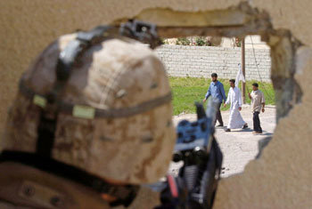 截至到14日,美軍海軍陸戰隊和費盧傑抵抗勢力已停戰4天。圖爲美軍海軍陸戰隊隊員正在通過牆壁中的小孔注視手舉白旗經過美軍佔領地區的伊拉克人。