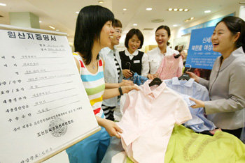 “直接從北韓進口的。”新世界百貨店江南分店舉行了“北韓産女裝展”,銷售北韓生産的服裝,該展銷會將持續到18日。百貨店方面表示,由於沒有經過中國而直接從北韓進口,其價格與相同質量的國內服裝相比低70%左右。根據不同種類,價格在2.9萬韓元到5.9萬韓元之間。圖爲16日,顧客們正在選購北韓産的服裝。