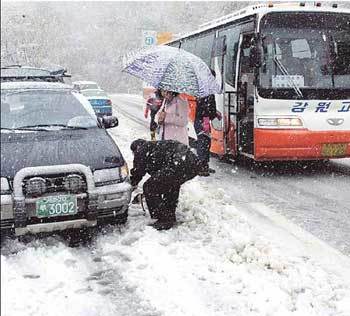 在即將進入5月之際,江原山區下起了大雪。27日,在寒溪嶺山路上,一位司機正在給車輪上防滑鏈。這一情景令人産生一種錯覺,真不知現在是春天還是冬天。