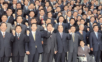 13日,第17屆議會選舉初選當選者在國會會館前舉起握成拳頭的左手,在拍紀念照。187名初選當選者從當天開始,將在2天內在國會憲法政治記念館接受有關議會政治工作的定位。