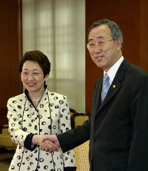 29日,外交通商部長官潘基文(右)正在外交通商部大樓接待室接待日本外相川口順子。當天,韓日外長對最近日本首相小泉純一郎訪北結果等問題進行了討論。