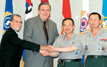 7日下午,在國防部中央會議室舉行了“未來韓美同盟政策構想會議”。會前,美方首席代表國防部副部長助理理查德·勞裏斯(左二)和韓方首席代表國防部政策室長權顔都正在握手。在當天的會議中,雙方就短期內縮減駐韓美軍問題展開了討論。