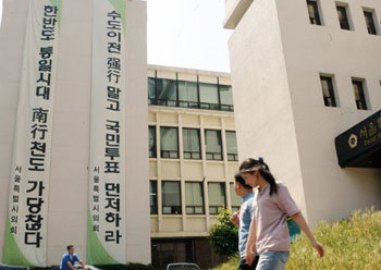 面對“是遷移行政部門,還是遷都”問題,有關各方正進行激烈爭論中,漢城市議會對位於漢城中區太平路1 號議會大樓挂上了反對遷都內容的標語,13日,經過該大樓的市民會有什麽感想呢?