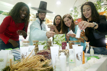 隨著掀起“Well-being”熱潮,利用天然原料製作的化妝品受到了人們的關注。17日,化妝品生産企業THE FACESHOP KOREA在漢城明洞展出了以紅參、大棗、甘草、石榴等傳統韓藥成分爲原料生産的化妝品。