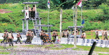 18日,只等政府一聲令下就奔赴伊拉克的宰桐部隊在國內某駐紮地進入了最後的訓練階段。圖爲隔著海棗樹,升起了太極旗和伊拉克國旗。