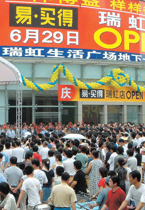 29日,新世界易買得在中國上海虹口區開設的上海第2分店“瑞紅”店正式開業迎客。店方稱,由於開張3小時就湧來無數顧客,出於安全考慮,將顧客分爲3批,而店方作爲超特價商品推出的1000桶5公升裝食用油(34.80元人民幣,約合5200韓元)僅在5分鐘之內就銷售一空。