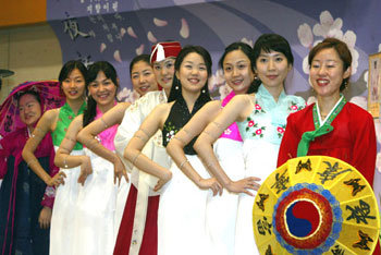 한복 잔치가 벌어졌다. 세계 미인대회에서 의상상을 수상한 한복, 파티용으로 개량한 한복, 전통 한복 등이 한자리에 모였다. 성신여대 문화산업대학원 파티 플래너 과정을 수강 중인 학생들이 9일 현대백화점 서울 목동점의 한복 의상전에서 자신들이 개량한 한복 등을 선보였다.